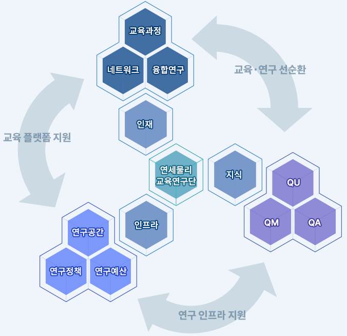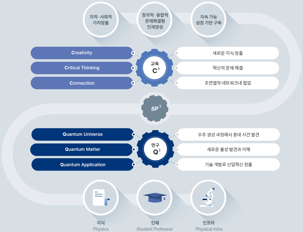 『연세 물리 교육연구단』은 ❶ 인재 ❷ 지식 ❸ 인프라 의 혁신 창출 3요소를 설정하고 이를 구체화하기 위해 교육, 연구, 제도 부문의 혁신 플랫폼을 마련한다. (1) 혁신 창출 3요소 강화 전략과 각 요소의 결합과 재조합에서 가장 중요한 요소인 사람과 사람 간의 네트워크를 활성화 할 수 있는 (2) 교육-연구 혁신 생태계 구축하고, 이를 통한 (3) 교육연구단의 사회적 문제해결 역할을 확대해 나가도록 노력한다.